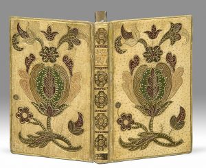 In-32 (84 x 55 mm), veau ivoire, filet doré, composition florale mosaïquée de maroquin vert olive, rouge, rose et verte, se détachant sur un semé doré, dos lisse orné, compartiments mosaïqués, roulette intérieure, doublure et gardes de tabis bleu, tranches dorées (Reliure de l'époque).