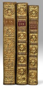 In-8, veau marbré, filet à froid encadrant les plats, dos orné, pièce de titre rouge, tranches rouges (Reliure de l'époque).