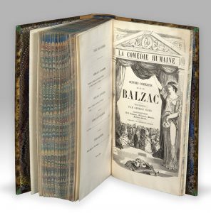 On a joint à cet exemplaire, en reliure uniforme de Trautz-Bauzonnet, l'édition originale des Cent contes drolatiques, colligez ès abbaïes de Touraine, et mis en lumière par le sieur de Balzac, pour l'esbattement des pantagruelistes et non aultres, publiée à Paris chez Gosselin en 1832-1837 (3 volumes in-8). Mention de seconde édition sur le titre du tome I. Fortes rousseurs à quelques feuillets du tome III.