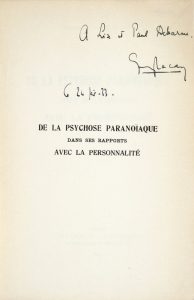 Thèse de doctorat soutenue à la Faculté de médecine de Paris le 7 septembre 1932 par Jacques Lacan (1901-1981), célèbre psychiatre et psychanalyste français, défenseur des thèses freudiennes.