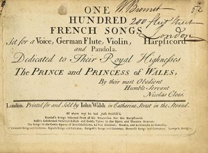 Nicolas CLOES. One hundred french songs, set for a voice, German Flute, Violin, Harpsicord and Pandola. (London, Walsh [1749]) ; in-8 à l’italienne, plein veau, pièce de titre en maroquin rouge au premier plat, 108 pp.