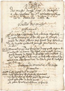 MANUSCRIT D’EPOQUE DU LIVRET DU BALLET DES MUSES, conforme à l’édition de Robert Ballard en 1666. Le manuscrit reproduit le texte complet de l’« Argument » et du « Dialogue de Mnemosine et des Muses » liminaire, et les sommaires, listes des personnages et distributions des rôles des 13 « entrées » qui suivent, ainsi que les chants de la 4e entrée, mais sans le texte de la Pastorale comique de MOLIERE incluse dans la 3e entrée, ni celui de la « petite comédie » Les Poètes dans la 6e. Le manuscrit ne comprend pas la 14e entrée (imprimée dans le livret) et s’arrête après la « XIIIe et derniere Entrée ». Parmi ceux qui « dansent au ballet » figurent Mme de MONTESPAN et Mlle de La VALLIERE (bergères), LULLY (Orphée), et LOUIS XIV (Cyrus)… Suivent les Vers sur la personne et le personnage de ceux qui dansent au ballet, recueillis les Œuvres d’Isaac de BENSERADE (Paris, Charles de Sercy, 1697, p. 357-377), c’est-à-dire les chants des 13 entrées du « Ballet royal des Muses ». Citons le quatrain de la 3e entrée célébrant Molière (« Le celebre Moliere est dans un grand esclat »…) et le huitain de la 7e entrée célébrant Lully : « Cet Orphée a le goust tres delicat et fin, / C’est l’ornement du siecle »…