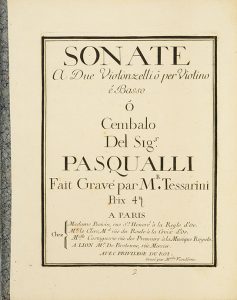 Nicolo PASQUALI (1718-1757). Sonate a Due Violonzello o per Violino e Basso o Cembalo. (Paris, Boivin, Leclerc, Castagnerie; Lyon, de Brotonne, 1749) ; petit in folio, broché 18 pp.