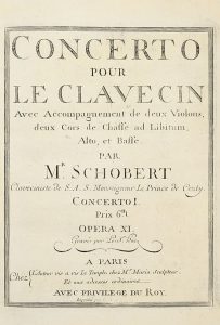 Johann SCHOBERT (c.1740-1767). Concertos pour le Clavecin n°1, 2, 3, 4, Œuvre XI, XII, XIII, XV, 15, 14, 15, 17 pp. ; Six Sonates pour Clavecin, Œuvre XIV, 45 pp ; Quatre Trio pour le Clavecin, Violon et Basse, Œuvre XVI, 25 pp. (Paris,...