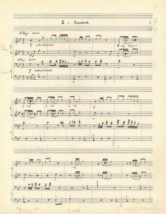 BEL ENSEMBLE DE CINQ PIECES POUR PIANO A QUATRE MAINS. I Ouverture, à 2/4 Allegro assai ; II Petite Marche, à 4/4 Lento, ma non troppo ; III Valse, à 3/4 Tempo di Valz, ben moderato ; IV Rêverie, à 3/4 Lento assai ; V Retraite [titre primitif biffé : Final], à 2/4 Presto, tempo di quadriglia. La page de titre porte la dédicace du recueil à Marcel ACHARD ; le manuscrit est à l’encre noire sur papier à 16 lignes, sauf la dernière pièce sur un bifolium à 28 lignes ; il est daté en fin : « Paris. Octobre 1925. Villefranche s/mer Février 1926 ». Il présente quelques ratures et corrections, dont 2 mesures biffées dans le 1er mouvement. Il a servi pour la gravure de l’édition chez Heugel en 1926. Ces Cinq Bagatelles sont très emblématiques de l’esthétique du Groupe des Six, et « conjuguent avec bonheur poésie et ironie » (Frédéric Robert). Auric les a tirées de musiques de scène pour La Femme silencieuse de Ben Jonson adaptée par Marcel Achard (24 novembre 1925 au Théâtre de l’Atelier) et pour Le Dompteur d’Alfred Savoir (18 décembre 1925 au Théâtre Michel). Il en réalisera une version pour 7 instruments, donnée le 2 mai 1926 à un concert Auric-Poulenc à la Salle des Agriculteurs. Discographie : Philippe Corre et Édouard Exerjean (Pierre Verany).