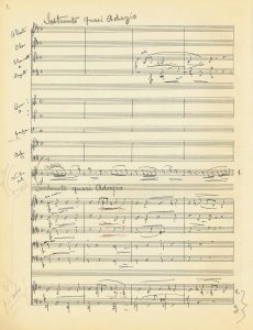 PARTITION D’ORCHESTRE DE CETTE ROMANCE POUR VIOLON DU COMPOSITEUR FLAMAND. En ré majeur, marquée Sostenuto quasi adagio, la pièce est composée pour violon solo, flûtes, hautbois, clarinettes, bassons, cors, trompettes, harpe, cordes, et le piano noté en bas des pages. Le manuscrit, à l’encre noire sur papier B & H à 20 lignes, est daté en fin du 20 février 1911 ; il présente quelques corrections par grattage, et a servi pour la gravure de l’édition violon et piano chez Heugel.