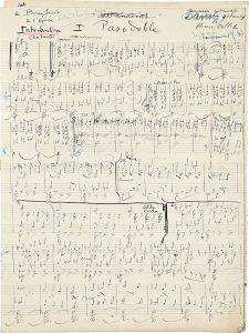 SUITE DE DANSES ESPAGNOLES POUR PIANO, formant à l’origine un « Ballet gitan » ; le titre primitif Gitanerias a été biffé et remplacé par Clavelitos. Henri Collet, outre son activité de critique musical (c’est lui qui inventa l’appellation du « Groupe des Six »), et son important travail de musicologue sur la musique espagnole, a composé de nombreuses œuvres, souvent inspirées par l’Espagne. Ce MANUSCRIT DE TRAVAIL, dans un cahier de musique à 14 lignes, à l’encre noire, présente de nombreuses corrections, certaines à l’encre rouge ou au crayon, d’importantes suppressions, et de nombreuses remarques d’instrumentation (et passages à développer) en vue de l’orchestration de l’œuvre. Il est dédié à « Bonifacio de l’Opéra », et a servi pour la gravure de l’édition chez Heugel en 1928, où certaines pièces n’ont pas été retenues et d’autres ont changé de numéro. Il comprend : I Pasodoble, « Introduction », Andante misterioso, en sol majeur à 3/4 ; II [IV] Farruca, marquée Allegretto, Capriccioso e rubato, en mi mineur à 2/4 ; III Zambra, Con moto, en la mineur à 2/4 (cette pièce est biffée d’un coup de crayon rouge) ; IV [II] Saeta, Jocoso, en si bémol majeur à 3/4 ; V Tango gitano, Lento ma non troppo, en sol majeur à 2/4 (une partie a été mise au net par un copiste sur un feuillet joint) ; VI Paño Murciano, Jocoso, en la mineur à 3/8 ; VII [III] Alegría, Con moto, en sol majeur à 3/4 (une « Introduction ad libitum » à la guitare a été biffée) ; VIII [VII] Sevillana, Jocoso, en sol majeur à 3/4. Discographie : Isabelle Oehmichen (Intégral, 1998).