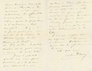 IMPORTANTE CORRESPONDANCE A SON ELEVE ET AMI, FERNAND HALPHEN (1872-1917), qu’il affuble d’une variété de titres : « jeune homme d’avenir », « hésitant », puis « compositeur », et à qui il donne (ou décommande) des rendez-vous de travail, et à qui il adresse des conseils, des invitations et plaintes, des nouvelles de ses engagements musicaux et mondains, de ses services à la Madeleine et de ses répétitions, des confidences sur ses ennuis financiers et sur la santé de sa famille, aussi bien que des billets enjoués, parfois en vers. On y rencontre les noms d’Emma Bardac, Cavaillé-Coll, Paul Dukas, la comtesse Greffulhe, Vincent d’Indy, Jules Massenet, Porel, Camille Saint-Saëns, etc. Nous ne pouvons en donner qu’un aperçu. [1888] : « Caligula [musique de scène pour la pièce d’Alexandre Dumas à l’Odéon] m’a beaucoup occupé ces derniers temps et va m’occuper encore, bien qu’il ne s’agisse que de très peu de chose. Mais lorsqu’on travaille pour un théâtre où la musique n’est que subsidiaire les difficultés s’accumulent. Donc cela n’a pas les proportions de l’Arlésienne : tant sans faut. Il y a à la fin du prologue une marche et le chœur des Heures du jour et des Heures de la nuit. Au 5e acte 3 petits chœurs et un petit air de danse. Et c’est tout ! […] Vous ne me dites rien de votre Romance ce qui me fait craindre que le baccalauréat ne lui ait fait du tort. Piochez ferme pour vous débarrasser de ce poids et sortir brillamment de la lutte »… [Paris 10 janvier 1890] : « ne commencez pas d’orchestrer votre mélodie avant que je vous ai vu : j’ai des projets à vous communiquer sur les instruments à choisir »... [Mai 1891]. Il part pour Venise : « Je ne vais plus agir et penser qu’en 6/8 » [CITATION MUSICALE] ; « remettez-vous au travail et songez maintenant à entreprendre de grosses besognes ! des morceaux développés et longuement conduits. Le mieux serait de faire bêtement, avec une symphonie d’Haydn ce que je vous ai fait faire jadis avec un de ses quatuors : c’est ainsi qu’on apprend le mieux ! »... Venise dimanche matin [31 mai]. Instructions pour faire un « calque » d’une symphonie de HAYDN : « Prenez des thèmes du même nombre de mesures, et suivez les expositions et les développements comme vous feriez d’un dessin. Les symphonies de BEETHOVEN sont déjà trop touffues pour un premier travail de ce genre. Je voudrais pendant quelque temps vous voir faire de ces travaux qui vous donneront une plume très ferme et très claire et très habile ! » Il évoque son séjour à VENISE : « Vous dire tout ce que je vois et de quelle vie charmante je jouis est tout à fait impossible ! C’est simplement délicieux et vous avez ici en réserve des impressions absolument inconnues, tout à fait merveilleuses. Bien que je n’aie rien à faire je suis si occupé à flâner de tous les côtés que je trouve à peine le temps d’écrire ! »… [Paris 1er novembre]. « Bon nègre viendra demain matin [...] voir si petit blanc a fait bonne musique ! »... [31 mai 1892]. « L’affaire GUIRAUD ne se décidera pas avant longtemps mais je suis en bonne posture ! » [la nomination de Fauré comme professeur de composition au Conservatoire sera repoussée par Ambroise Thomas]... [20 juillet], rendez-vous au Café de Londres : « nous orchestrerons sur une table de marbre. Savez-vous combien je vous envie d’aller entendre Parsifal ? à Vendredi 999,000,000,000,000,000,000,000 d’amitiés. Je ne sais pas combien ça fait, mais ça n’est pas encore assez. Ga-Fau-briel-ré ». – Il l’a trouvé « tiède pour les merveilleux Maîtres chanteurs le plus humain des trois ouvrages que vous avez entendus »… [29 octobre] : « Je suis enchanté que vous soyez entré chez MASSENET puisque vous le désiriez et que vous avez des amis dans sa classe. J’espère que mon amitié pour vous ne sera pas un obstacle à ce qu’il s’intéresse à son nouvel élève. Du reste il a assez de flair pour comprendre vite que vous pouvez lui faire honneur »... [20 novembre] : « Avez-vous demandé à M... [Massenet] de vous donner une longue besogne ? J’ai raconté cela à d’I... [Indy] qui a parié qu’il vous laisserait faire ce que vous voudriez mais ne vous tracerait aucune ligne de travail. Entamez donc une pièce symphonique en la PENSANT orchestralement »... SAINT-SAËNS « a fait un petit article biographique sur G. Fauré (le connaissez-vous G. Fauré ?) »... Il termine par un amusant poème (6 vers) : « Les lapins et le faisan, / quelle bonne nourriture »…., qu’il signe « de Victor Hugo, par télé-tombes »…[Novembre]. Amusante invitation à souper en 12 vers, « Et puis, pleins d’allégresse, / Vers la grande opéra, / dans un vieux véhicule / ous qu’ nous nous empil’rons, / ce n’sera pas ridicule / D’aller entrendr’ Samson ! »... – Deux lettres sont relatives à l’inscription d’Halphen comme auditeur au Conservatoire dans la classe de Théodore DUBOIS ; puis : « Dubois m’a parlé de vous : il est content de votre assiduité et il croit que vous serez élève cette année »… Mercredi [14 juin 1893], sur un formulaire administratif, il regrette de ne pouvoir venir à Ville d’Avray, avec quelques mesures de musique, et signe « Alexis Colophanor », inspecteur des « Prisons et des Bicyclettes à double échappement pour ecclésiastiques »... Lundi [10 juillet]. Il est pris à la Madeleine et au Conservatoire pour le « concours d’harmonie des femmes ». Il va s’informer du concours de fugue : « je serais bien heureux s’il vous était favorable ». Il mène « une vie errante en perpétuel tramway » entre Prunay et Paris : « Travail nul, par-dessus le marché »… [21 novembre] : « Eh quoi ! Sous l’habit militaire / Ton cœur ne bat’il plus pour moi ? / Ô Fernand, ce doute m’atterre ! », etc. ; il signe « Gabriel Fauré candidat à toutes