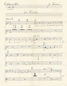 Partie de clarinettes pour la version pour petit orchestre du cantique pour voix et piano ou orgue, En prière, sur un poème de Stéphan Bordèse (première audition du cantique aux Concerts Colonne, 28 décembre 1890), notée à l’encre noire sur papier à 10 lignes.