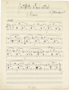sont successivement (l’ordre initial sera légèrement modifié dans l’édition) : I Primavera (Andante, en do majeur à 2/2) ; II Solitude (Moderato assai, en mi mineur à 2/4) ; III Sur la prairie verte (Allegro moderato, en la majeur à 4/4) ; IV L’ombre (en si mineur à 3/4) ; V Refrain joyeux (Allegro, en sol majeur à 2/2) ; VI Conte (Moderato, orribilmente, en do mineur à 4/4) ; VII Consolation (Moderato, en fa majeur à 3/4) ; VIII Orphelin (Lento, en si bémol mineur à 2/2) ; IX Mazurka (Dansant, en si bémol majeur à 3/4) ; X Les nuages errants (Moderato, poetico, en mi bémol majeur) ; XI Oriental (Moderato, en sol mineur à 6/8) ; XII Heureux événement (Allegro, ma non troppo, en mi bémol majeur à 2/4). La page de titre est rédigée en français et en russe. Le manuscrit, à l’encre noire sur papier à 18 lignes, a servi pour la gravure de l’édition chez Alphonse Leduc en 1930.