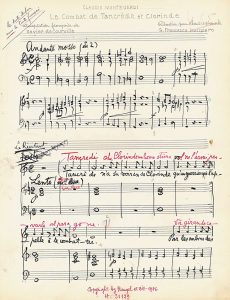 ADAPTATION POUR PIANO ET CHANT DE L’ŒUVRE DE CLAUDIO MONTEVERDI. Cette réduction pour chant et piano a été réalisée à la demande des éditions Heugel, qui ont publié en 1946 cette version française du Combattimento due à Xavier de Courville. Le manuscrit est noté sur papier à 12 lignes, à l’encre noire pour la musique et les paroles françaises, celles-ci notées sous la ligne de chant, tandis que Malipiero a inscrit à l’encre rouge le texte italien au-dessus du chant. Le manuscrit a servi pour la gravure. Au dos du titre, on a collé une notice dactylographiée en italien. ON JOINT une L.A.S. de Malipiero faisant rapporter les épreuves par Piero Ferraris et donnant le bon à tirer (Venise 26.XI.1946).