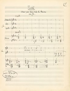 CHŒUR POUR VOIX DE FEMMES ET PIANO : « L’airain résonne… Il est minuit »… L’auteur des paroles n’est pas identifié ; peut-être s’agit-il de Massenet lui-même. Le chœur de sopranos et contraltos, avec un soprano solo, est accompagné par le piano. L’œuvre est en ré majeur, Andante à 3/4. Selon son habitude, Massenet a inscrit sur son manuscrit des notations personnelles. Page 1 : « Paris. Jeudi 21 fév. /95 chez moi, rue du gal Foy, 46. 5 ½ soir ». Page 6 : « Vendredi 22 fév. /95. 2 ½. Je suis souffrant. Les élèves de la classe viennent chez moi – je fais le cours dans ma bibliothèque. D’Ollone, Koechlin, Moret, Hirschmann, Tarriot, Halphen ». À la fin du manuscrit (p. 11) : « Paris. Samedi 23 fév. /95. 9 h matin ». Le manuscrit, soigneusement noté à l’encre brune sur papier Lard-Esnault à 20 lignes, présente quelques corrections par grattage ; il a servi pour la gravure de l’édition chez Heugel en 1895.
