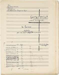 IMPORTANT MANUSCRIT DE TRAVAIL DE CE GRAND ORATORIO. Composé pendant la guerre à Villemeux (Eure-et-Loir) et surtout à Fondettes, aux Pivottières (Indre-et-Loire), sur un livret de Georges Migot lui-même, cet oratorio a été révisé à Saint-Jean d’Angély (Charente maritime) de juillet 1945 à mars 1946. La première audition intégrale de cette œuvre gigantesque (1 heure 45 minutes) fut donnée par l’Orchestre National et les Chœurs de la R.T.F. sous la direction de René Alix, le 25 juillet 1957. Ce manuscrit de travail est celui de la réduction piano avec chant (le chœur noté sur 1, 2, 3 ou 4 portées). La page de titre porte la dédicace (« Illis / Qui laboraverunt, / laborant, / laborabunt / ut Adveniat Regnum Ejus »), et, disposés autour d’une grande croix dessinée à l’encre, une grande signature et les dates (« 2 août 1941-18 octobre 1942 ; refait 1945-1946 ») et le titre (« La Passion oratorio en douze épisodes pour soli, chœurs, orchestre. Livret de GM août 1939 ») ; en bas la table avec les 12 épisodes, leur page et leur minutage (durée totale 2 heures, rectifiée en 1 h 45). En regard : « La Radio-chaîne Nationale en a donné : 1/ 4 épisodes le 16 XII 46 ou mai 47 ; 2/ 8 épisodes – avril 52 ; 3/ Audition intégrale le 25 juillet 57. 2 auditions à grande distance Radio Hilversum ». La Passion comprend 12 parties. Chaque partie est précédée du titre, avec dessin de la croix ; chacune est signée en fin du monogramme avec les dates de composition et révision, plus le minutage au crayon : 1 Complot contre Jésus, « Comme un prélude. Grave – à la fois hiératique et pathétique », 2-8 août 41 Les Pivottières / Juil. 45 St J. d’Ay (p. 1-8). 2 L’Onction de Béthanie, « Comme une procession et un choral. Modéré – chantant – soutenu », Pivottières Villemeux 9 VIII 13 IX 41 / VIII.45 St J. d’Ay (p. 9-20). 3 Trahison de Judas, « Comme un scherzo. À la fois décidé et grave », Les Pivottières 20-23 IX 41 / VIII.45 St J. d’Ay (p. 21-26). 4 La Cène, « Comme une complainte. Grave mais allant », Les Pivottières 24 sept.-1 oct. 41 / 22 oct.-26 oct. 45 St J. d’Ay (p. 27-50). 5 Jésus à Gethsémané, « Comme une marche funèbre », Pivottières 27-30 oct. 41 / XII-45 St J. d’Ay (p. 51-57), « enchaîner à l’épisode suivant ». 6 Arrestation de Jésus, « Comme une marche – modéré », Les Pivottières 27-31 oct. 41 / 28 nov. IXbre 45 St J. d’Ay (p. 58-62). 7 Jésus devant le Sanhédrin, « Comme un fugato. Décidé », Les Pivottières 6-7 janvier 1942 / II 46 St J. d’Ay (p. 63-71). 8 Le Reniement de Pierre, « Comme une pastorale triste. Allant – modéré », Les Pivottières 11 janv. 42 / II.46 St J. d’Ay (p.72-77). 9 Jésus devant Pilate, « Comme un mouvement symphonique en double-estampie. Allant, comme une marche pesante », Les Pivottières 12-14 janv. 42 / 10-16 fév. 42 / rien changé II 46 St J. d’Ay (p. 78-105). 10 La Couronne d’Épines, « Comme un rondeau double. Allant – tenacement », Les Pivottières 30 mars-6 avril 42 / III 46 St J. d’Ay (p. 106-136). 11 Le Calvaire, « Comme versets et repons. Allant – douloureux », Les Pivottières 2-4 mai 42 / rien changé III 46 St J. d’Ay (p. 137-148). 12 La Crucifixion, « Allant – Lent », Les Pivottières Ce dimanche 18 octobre 1942 / et mars 1946 Saint Jean d’Angély (p. 149-193) ; à la fin de la p. 153, 2 grandes croix avec cette note : « Ici, ce 25 juin, à 11 h 30 du matin, mon cher oncle Paul, tant aimé, retournait à Dieu », et en haut de la page suivante : « Le 24 août je reprends l’œuvre ». Le manuscrit, à l’encre noire sur papier à 18 lignes en 9 cahiers (plus qqs ff libres), présente de nombreuses corrections par grattage ou au crayon, quelques ratures et corrections, et quelques collettes (p. 32), une coupure indiquée (p. 115-118) ; de nombreuses indications au crayon d’instrumentation, d’accents, de dynamique, de tempo, de liaisons et de nuances. On remarquera que Migot avait à l’origine prévu également un orgue (mentionné et biffé sur la page de titre, ainsi que dans le cours de la partition). La partition présente également des remarques pour le travail d’orchestration (avec la pagination de la partition d’orchestre indiquée tout au long au fur et à mesure du travail d’orchestration) : « ici combinaison instr. acct. la voix du Christ » (p. 30), « à la fois ternaire et binaire en ses accents – à l’orchestre, chercher des aigus alternant avec des mediums au-dessus des basses » (p. 106 au début du 10), « Tout cet épisode pp tant que dure le texte verbal. Orchestre le plus possible aux vents. CB, Vlles, Timb., G.C. pour les pizz obstinés » (p. 137 au début du 11), etc. Sur la couverture cartonnée de la reliure, Migot a dessiné à l’encre une croix, avec la couronne d’épines et les clous, et inscrit son nom, les dates et le titre. Discographie : Chœur et Orchestre de la Radio Hollandaise, Marinus Voorberg (Arion, 1999).