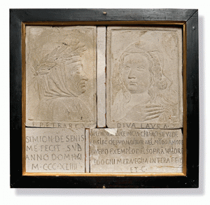 PORTRAIT DE PETRARQUE ET DE LAURE DE SADE Plâtre gravé du double médaillon en bas-relief du poète toscan Francesco PETRARCA (1304-1374) et de sa muse, Laure de SADE (1310-1348) d'après les originaux en marbre se situant à Florence comme...