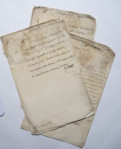 4 letters on large 4to pages with important water stain to the upper part and chipped edges, 2 letters on simple 4to leaf with chipped edges, and 1 8vo letter