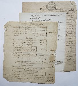 - 1 feuillet in-8, manuscrit, plié avec les bords effrangés avec petits manques, intitulé «Contrat de mariage du 1er mai 1763», décrivant les sommes avec les dates correspondantes, jusqu'au 20 juin 1777.