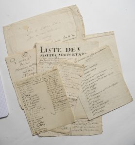 Sur sept documents différents (34 pages in-8 et 12 pages in-4 au total avec enveloppe de la main du Marquis), est relevée la liste des visites venues et à rendre, les visites de Monsieur et Madame le Marquis de Sade pour les années 1769 et 1770.