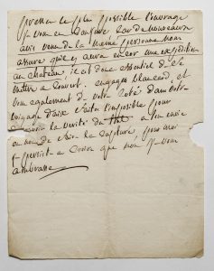 Mot manuscrit de la main du Marquis de SADE à son épouse que l'on peut situer le 9 ou 10 juillet 1772 du château de La Coste.