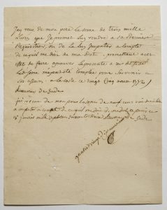 Il s'agit en l'espèce d'une reconnaissance de dette de 3.000 livres que Madame de Sade s'engage «à rendre à la première réquisition ou de l'imputer à compte de ce qu'il me doit de ma dot» cela «pour survenir aux affaires de mon mari». Reconnaissance de dette qui est doublée en-dessous par une seconde datée du 15 janvier 1773 pour 923 livres.