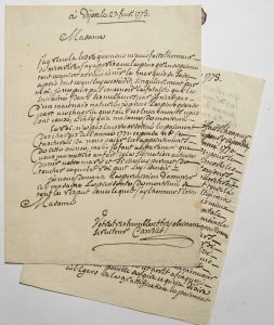 A - Adressée à la Marquise de Sade, 1 page, datée du 27 février 1773, à Dijon, avec nom et adresse de la Marquise au dos et trace de cachet de cire. Il lui parle de son mari, «...j'ai appris avec la plus grande peine tout ce qui est arrivé à Mr le Marquis de Sade, après tout ce qui lui a été dit, singulièrement par moi, je ne puis pas concevoir la fatalité qui l'a entrainé dans ses malheurs, car il n'est pas d'un mauvais naturel, je prends la plus grande part au chagrin...», et lui demande des précisions avant paiement des charges dues par l'Etat au Marquis: «... Je tâcherai de vous payer les appointements de cette année, mais il faut auparavant que vous me mettiez au fait de la situation actuelle de votre mari et si elle lui permet de toucher ce que le Roi peut lui devoir».