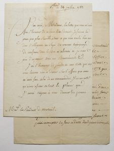 Autograph letter by a secretary, 2 leaves, 8vo, signed by Ormesson, dated July 24, 1783 and addressed to the Présidente de Montreuil. Only the first two pages are written