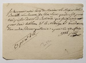 Quittance suite à paiement par le Major de la Bastille pour des travaux (fournitures de tableaux et de verres de bohême) d'aménagement de la cellule du Marquis au deuxième étage de la Tour Liberté à la Bastille après son transfert de Vincennes fin février 1784.