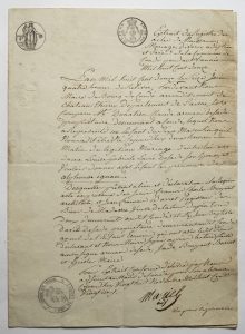 Bi-feuillet in-qurato dont les deux premières pages sont manuscrites avec sceaux et signature.
