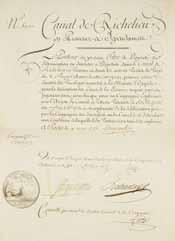 Provence - Canal de Richelieu Action du canal de Richelieu, émise au porteur le 9 mai 1753, une p. in-folio entièrement gravée (texte et illustration), illustrée d’une gravure de médaille et signée Despuech, Albertas,
