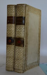 2 vol. In 12 plein parchemin, dos ornés de compartiments enfermant des médaillons mosaïquées en maroquin, encadrement de dentelles sur les plats, tranches dorées, 212, 223, 28 pp.