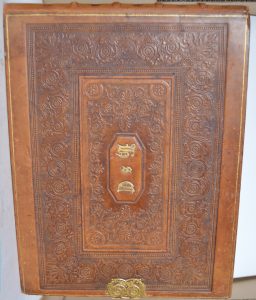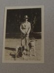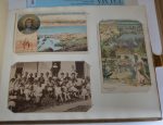 In 4 oblong, plein veau glacé orné à froid, fermoir, Cet album commence par une photographie contrecollée d'un homme élégant tenant deux chiens en laisse et une carte postale représentant Lamoricière (Christophe Louis de), puis 10 CP (colonies), cote des somalis, Soudan, Tunis, Tanger... Puis une série de 8 CP (Suisse), puis une série de 8 CP (châteaux), puis une série de 11 cartes diverses, puis une série de 16 cartes intitulées végétation marine - algues naturelles, puis une série de 7 cartes «  le charmeur d'oiseaux au jardin des Tuileries ».
