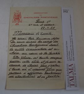 2 ff. In 8 datée du 22 juillet 1928, dans laquelle il écrit à un ami qu'il serai heureux de lui ouvrir les rangs des chevaliers pontificaux.