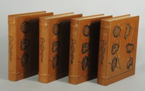 Quatre volumes, in-4, reliures de l'éditeur en peau moutarde. Dos et plats recouverts d'un décor en creux représentant les signes du zodiaque reliés par deux filets, à froid et doré. Têtes dorées, titres dorés aux dos, étuis bordés. Bois originaux de Jean CHIÈZE. Exemplaire enrichi d'un envoi autographe signé de l'artiste.