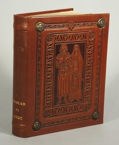 Bois originaux de Jean CHIÈZE 1 vol., Pleine reliure peau fauve, décor estampé sur le plat de personnages en pied et boulons métalliques au coins, dos à 2 nerfs apparents orné or, tête dorée.