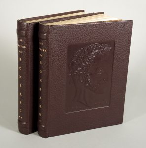 2 vol. petit in-4, rel. de l'éd., dos à deux nerfs, titre doré en long, portrait de Ronsard frappé à froid sur les plats, tête dorée, étuis à rebords.