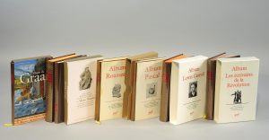 ALBUMS BIBLIOTHÈQUE DE LA PLÉIADE. Lot de 7 Albums (très bon à excellent état) : - ROUSSEAU, rhodoïd, jaquette et étui. - PASCAL, rhodoïd, jaquette et étui. - Album du GRAAL, rhodoïd et étui. - LEWIS CARROLL, rhodoïd et étui. - CLAUDEL,...