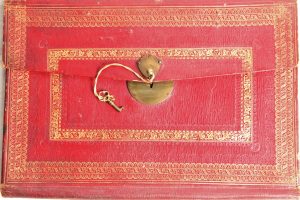 Dimensions : environ 400x250 mm, intérieur maroquin bleu nuit (légèrement frotté)