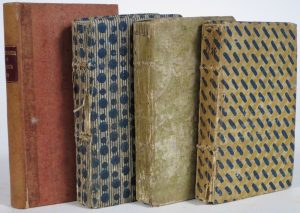Bruxelles, J. Vanden Berghen, 1782, 1786, 1789, 1792. 4 vol. pet. in-16° (n.c.). Par ordre chronologique : bradel moderne plein papier rouge (traces de pap. collant aux mors),- plein papier à impression fleurie en relief, sous chemise et étui modernes (usagé, manques au dos),- plein papier dominoté d'édition,- id.
