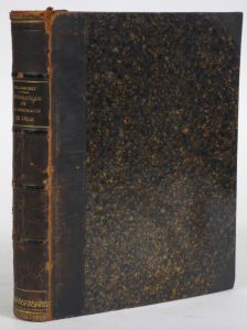 Rel. de l'époque : demi-basane foncée à coins de percaline chagriné noire, plats de papier marbré, dos à nerfs sertis de filets à froid et dorés et de roul. dorées (mors, dos et coiffes frottés, coupes et 2 coins émoussés).