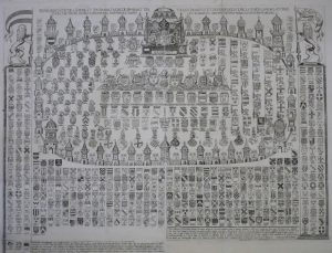Eau-forte, en 2 ff. collés in-plano, 59 x 81 cm + marges (64 x 83,5 cm), 2 colonnes de 6 et 5 lignes chacune gravées dans la partie inf. suivies de la mention "Henrÿ Lutg. [Lutgens] Fecit Cum privilegio" (découpe dans la marge de g., trace d'un papillon destiné à cacher qqch en bas de la 1re feuille à dr.). Illustré de +/- 600 blasons.