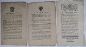 (3). s.d. (Mechelen, P.J. Hanicq), 4 pp. in-f° : "Consultatie gehouden by ordre van Gouvernement, over de beste middelen om te geneesen den Rooden Loop [...]", idem supra, recommandations pour diverses décoctions (dont une du médecin anglais Thomas Sydenham, 1624-1689, qui inventa le laudanum) contrer la dysenterie.