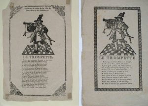 [ Bruxelles, 2e moitié du 18e s.]. 3 pièces ornées d'un bois et serties d'un cadre typographique fleuronné, +/- 35 x 20 cm, papier vergé à belles marges, texte en français (bonne condition). Relais entre la population et les pompiers, les "trompettes" étaient installés dans des guets aux sommets de deux tours de Bruxelles (à l'Eglise de la Chapelle et à la Tour St-Nicolas, près de la rue au beurre) afin de donner l'alerte en cas d'incendie. Dans les cas de feu, le trompette sonnait le tocsin et fixait, du côté de la tour où le sinistre était déclaré, un drapeau rouge ou, la nuit, un falot afin de permettre aux pompiers de se rendre sur place. C'est par crainte de voir le veilleur s'assoupir qu'on l'obligeât à sonner la trompette chaque heure de la nuit. Il accompagnait, paraît-il, son morceau du cri "Surveillez vos feux et chandelles". Peu rémunéré pour ses prestations, il allait quérir ses étrennes en échange d'une des feuilles comme celles que nous vendons ici. Son rôle fut supprimé en 1850.