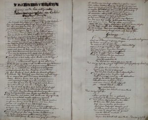 Overwegingen en liedteksten (met wijsaanduiding) ter gelegenheid van het feest van de H. Isabella, "Den Dronkaert", "Een bezoek tot het onderaerdsch Roomen", grafschriften o.m. voor Coleta Prudentia Simon en voor Teresia Van Sevennant (dochter en echtgenote van de auteur, onderwijzer te Brugge), "Une résolution prise", nieuwjaarswensen en (hulde-)toespraken (o.a. voor feest van Simon Stevin), "Vriende Versen", "Trouw Dicht", treurdicht bij het overlijden F.R. Boutsen, bisschop van Brugge...