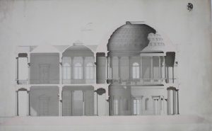 Projet donné par François Verly (1760-1822), de 1815 à 1822 au service du Prince Guillaume à Bruxelles, probablement à dater après l'incendie de décembre 1820 qui avait détruit le palais du Prince d'Orange à la rue de la Loi. Verly, architecte néo-classique français, mis son art d'abord au service de Louis XVI puis de la Révolution et était architecte du Gouvernement à Lille.