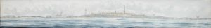 Origineel aquarel op papier, 5 x 35 cm. Onder passe-partout. Panorama van Oostende vanaf de Noordzee met van west naar oost : het fort Napoleon (1811), de haven, de eerste vuurtoren (1771), de Kapucijnerkerk, de Sint-Pieterskerk, het fort Wellington (1812), evenals verscheidene windmolens. Oostende was populair bij Engelse kusttoeristen aan het begin van de 19de eeuw voordat het in het tweede kwart van de 19de eeuw uitgroeide tot een mondaine badplaats onder de aanwezigheid van Leopold I en de koninklijke familie.