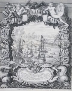 Représentation du Siège d'Ostende en 1706 avec les forces navales en train de bombarder la ville. La scène est présentée dans une cadre allégorique et agrémentée d'un cartouche dont le texte en italien fait référence au Siège d'Ostende (1601-1604), la bataille la plus sanglante de la Guerre de Quatre-Vingts Ans, qui eut lieu 100 ans plus tôt.