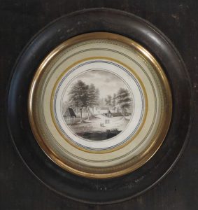 DESSIN ORIGINAL, plume et pinceau à l'encre bistre, sur papier, médaillon 5,9 cm diamètre, titré en bas, cerné d'in doublé filet circulaire. Sous passe-partout, vitre et cadre de bois acajou avec anneau central de cuivre (non désencadré).