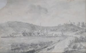 Vue de Salzinnes et son abbaye de moniales cisterciennes (abbaye du Val-Saint-Georges), par un petit maître. "Fondée au début du XIIIe siècle dans la plaine de Salzinnes (à l’ouest de Namur) et en bord de Sambre (rive droite), elle fut supprimée à la fin du XVIIIe siècle. Il n’en reste aucune trace" (# Wikipedia).