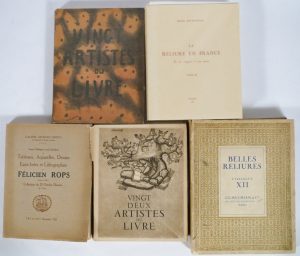 Livres de sciences : réunion exceptionnelle de 3 ouvrages illustrés par Pieter Apian, hydrographie & hydraulique (Bélidor), astronomie, mathématiques, horlogerie, médecine, microscopie (Ledermüller), botanique (Dodoens), histoire naturelle (Buffon), ingénierie (poliorcétique : Scala, Vauban, Nicolas de Fer)… Dessins (Van Dyck, Quast, Berchem, Tiepolo, Ensor, Cuyp, Madou, Spilliaert, Livemont, Ewing, Ben Salem, Spilliaert, Sadji…), gravures (De Bruycker, Danse macabre d’Holbein dans une reliure à plaque de l’époque (Annonciation), peintures à l’huile (portraits et scènes religieuses)… Arts décoratifs & Architecture : dessins & aquarelles (projet d’un magasin à Londres, piscine, maisons), livres illustrés par Mucha & Verneuil, ouvrages sur la perspective, les œuvres à Versailles par Gavard, ouvrages sur les Arts Nouveau (Mucha) & Déco. Voyages : Panama, Kentucky (missionnariat), Chine, Égypte (Denon), Pacifique… Atlas & cartes (Ferraris), Histoire (Recueil de chartes par Hay), Économie (Rey de Planazu), Bibliophilie, Littérature moderne, Religion, nombreux ouvrages en italien (Il Pomodoro, Sardi, Il Paradosso)… Éditions du 16e s. : réunion de 7 post-incunables dans une rel. à plaque flamande (portrait de Charles Quint), nombreuses éditions aldines (auteurs anciens), Amadis de Gaules (6 livres), Bible de l’Ours, métrologie (Agricola), Reliures remarquables (à la cire, à dentelle, décorées, à plaques, armoriées, brodées…), Manuscrits & Archivalia : livre d’heures flamand (1572), constitution d’une confrérie espagnole, vie de Pie IX (enluminé), Importante section relative à la Belgique : livres (nombreux ouvrages sur Liège), rares dessins topographiques, cartes, manuscrits & archives (Album amicorum de musiciens belges exilés à Londres en 1915, correspondance de Léopold Ier avec un de ses ministres…), photographies (Armée du Salut)