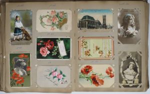 Dans un album in-f° ad hoc : pleine toile grise, plat sup. titré doré "Cartes postales" dans un encadrement de fleurs en relief dans les tons vert, jaune et rouge, dos lisse (piqûres, us.).