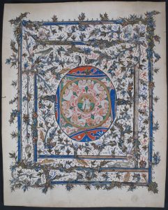 PEINTURE ORIGINALE avec traits de plume et rehauts d'or à la feuille, sur vélin, le tout découpé et collé sur un carton de support, 20 x 17 cm.
